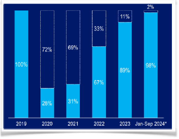 中国旅游收入的恢复也很明显。国际收支数据的分析表明,我国2024年第3季度旅游贸易分项出口录得103亿美元,已恢复至2019年同期的116%。