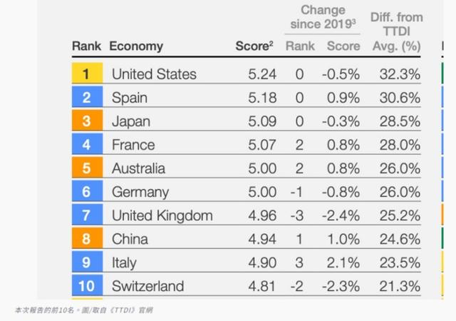 这其中,中国的旅游业竞争力显著上升,根据全球经济论坛(WEF)统计的2024年“旅游业竞争力指数”(Travel & Tourism Competitiveness Index),排名前10的国家分别是美国、西班牙、日本、法国、澳大利亚、德国、英国、中国、意大利和瑞士,中国排名自2019年的第13名上升至第8名。