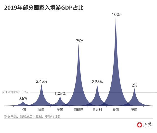 2019年我国的外国人入境游收入为771亿美元,仅占GDP的0.5%,而同期欧洲国家法国、西班牙、意大利等占比均超过2%;此外亚洲国家中,泰国表现尤为优异,占比超过10%;全球的平均水平约为1.5%,我国的入境游收入占比尚且低于全球平均水平,若能提升至全球中值,入境游市场有千亿美元的增量空间。