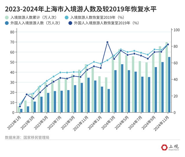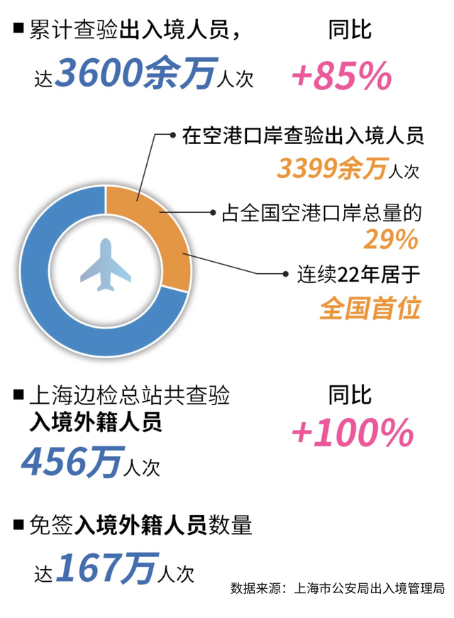 2024年上海共有3600余万人次出入境,同比增加85%。前11个月,上海口岸入境外国人超400万人次,是去年同期的两倍,在全国空港中位居首位。前11个月,上海共接待国际旅游入境人数达596.55万人次(包括港澳台),较去年同期增长86.4%。