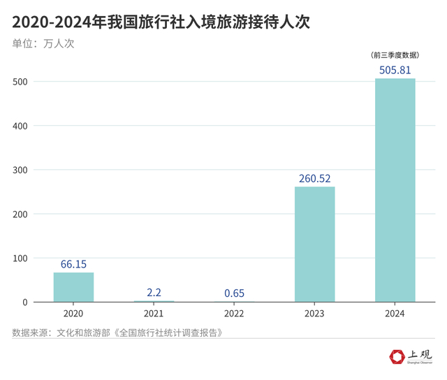旅行社入境旅游接待人次也明显增长,前三季度即接近2023年的2倍左右。据文化和旅游部副部长张政此前透露,前三季度,预计总的入境旅游人次达0.95亿,同比增长55.4%,已恢复至2019年同期的93.4%。
