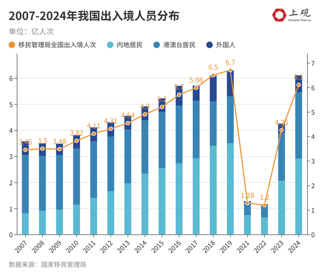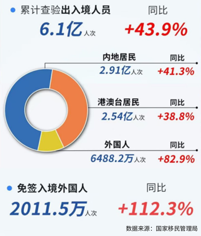 仅从出入境总人次来看,这个数据已经恢复到了2019年(6.7亿)的90%以上。