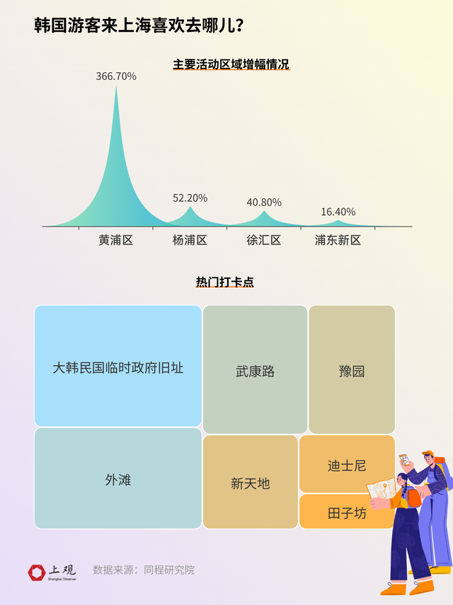 入境后,韩国游客在上海的活动区域主要集中于黄浦区、杨浦区、徐汇区以及浦东新区。黄浦区的订单增幅达366.7%。韩国游客热门打卡点大韩民国临时政府旧址、外滩、武康路、豫园、新天地、田子坊均在黄浦区。除此之外,环球金融中心、金茂大厦、上海中心、东方明珠,上海几大地标也都是韩国游客来沪热门打卡点。