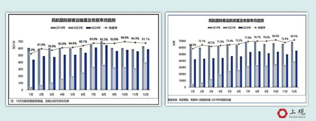 在政策和市场的共同作用下,2024年,国际航班及旅客运输量恢复情况可观。民航国际客运航班达58.5万班次(日均1604班次),同比2023年增长93.4%,同比2019年航班恢复率达74.8%;2024年我国民航国际旅客运输量达0.65亿人次(仅含境内航司承运数据),同比2023年增长124%、同比2019年恢复率为87.7%。