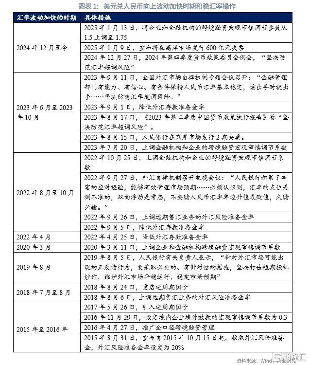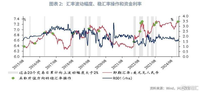 我们曾在2023年11月发布的报告《流动性背后的汇率考量》[1]中对汇率向上波动加快时期的资金面进行梳理,发现当汇率在短期内出现较大幅度波动时(如20个交易日内累计向上波动幅度超过2%),可能触发央行采用逆周期汇率政策操作;而部分对应时期的银行间资金面,出现了偏紧的情况,典型的时期包括2019年8月、2022年8月至10月、2023年9月至10月和2024年12月以来。本篇报告将从各类汇率工具对银行间人民币流动性影响机制的角度,梳理分析不同工具组合下的流动性情况。