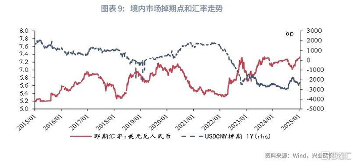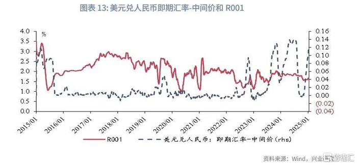 国有大型银行在掉期和即期市场上的交易对银行间流动性存在结构性影响,当前人民币外汇掉期的总成交规模约为银行间质押式回购成交量的10%。在人民币外汇掉期市场上,当人民币汇率向上波动幅度较大时,国有大型银行通过掉期交易在近端买入美元(远端卖出美元),同时在即期市场卖出美元、购入人民币,起到稳定汇率的效果。对于银行间市场的人民币流动性而言,国有大行在即期市场的卖出美元、购入人民币,起到了吸收人民币流动性的效果。由于国有大行当前在银行间市场上扮演人民币流动性的主要净融出方,国有大行的上述交易虽然不影响基础货币投放,但在影响市场中小机构的流动性供给方面,与央行参与外汇买卖有异曲同工之处。以2024年12月为例,人民币外汇掉期的全月成交金额(包括近端买入和卖出方向)约为16万亿元人民币,日均7300亿元人民币;而当月银行间质押式回购的全月成交额达到166万亿人民币,人民币外汇掉期规模占银行间质押式回购的10%左右。