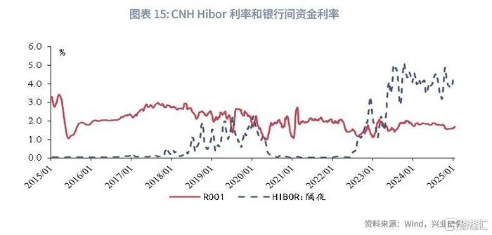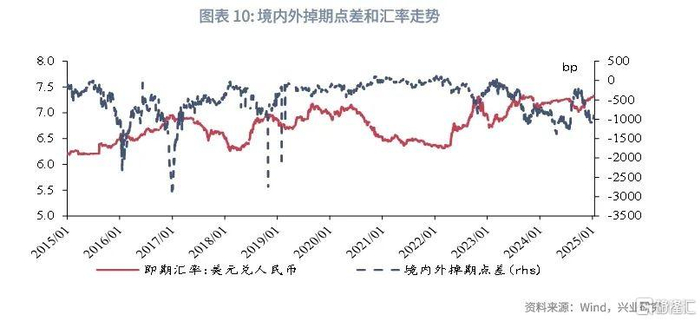 央行通过发行央票等方式,调节离岸市场的人民币流动性,可以作为在离岸市场稳汇率的手段之一。2025年1月9日,人民银行宣布在离岸市场发行600亿元央票,创下在离岸市场发行单期央票规模的新高。由于上述操作可能和国有大行在境内外汇市场的交易同时出现,在离岸资金利大幅上升的时点,也可能出现银行间流动性偏紧的现象。例如,2023年8月至10月期间,境内外掉期点大幅下行,同时在离岸市场发行央票,境内资金面也明显偏紧。2022 年8 月至10 月、2023 年8月至10月和2024年12月以来,均出现了离岸和银行间资金利率同步收紧的情况。