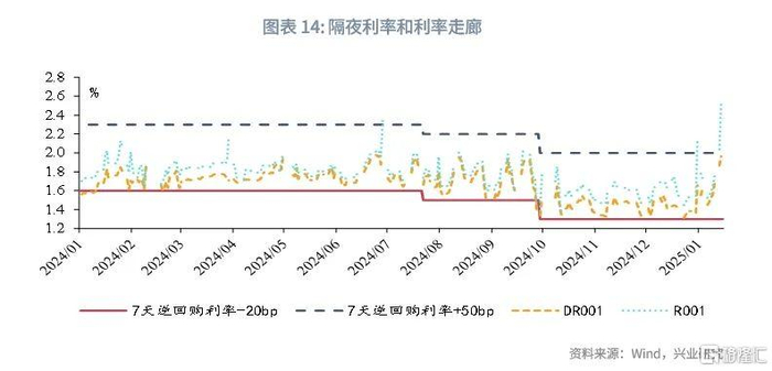 1月13日,人民银行宣布将企业和金融机构的跨境融资宏观审慎调节参数从1.5上调至1.75。近期银行间市场资金面偏紧,临近1月税期,叠加春节前现金走款扰动,央行1月10日宣布暂停买入国债,逆回购投放持续保持克制,1月14日至15日,DR007达到2.2%-2.3%的较高水平。
