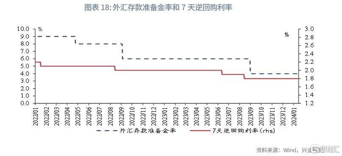 从下调外汇存款准备金率时点附近的降息操作来看,降息操作和稳汇率操作可能相伴出现。在2022年9月外汇存款准备金率下调之前,人民银行进行了降息操作,即2022年8月的降息;2023年6月至9月的降息操作和稳汇率操作同步开展,2023年6月,7天逆回购利率下调,此后,2023年7月,央行上调金融机构和企业的跨境融资宏观审慎调节系数,2023年8月,在PMI连续4个月处于荣枯线下方、信贷同比明显少增的背景下,央行再次下调7天逆回购利率,2023年9月,先后下调外汇存款准备金率和人民币存款准备金率,这一时期的政策组合凸显了我国货币政策“以我为主,内外均衡”的政策原则。
