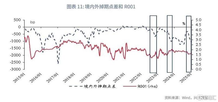 随着上述交易的进行,境内市场掉期点可能被显著压低,境内外掉期点差下行,银行间流动性可能出现偏紧格局。例如,2024年10月中旬,国有大行交易方向反转,下半月近端净买汇超过500亿美元,月末境内外掉期点差达到-600bp[5]。从境内外掉期点差大幅下行时期,境内流动性收紧的案例来看,2022 年8 月至10 月、2023 年8月至10月和2024年12月以来较为典型。应当指出的是,不同于2015年至2016年期间央行外汇占款大幅下降对基础货币的回笼,造成了资金利率中枢的持续抬升;国有大行的外汇交易对流动性的影响是边际上的、体量相对也更小,当银行间流动性处于相对均衡格局下时,更容易因此加剧流动性紧张格局,这种影响通常也是暂时性的。