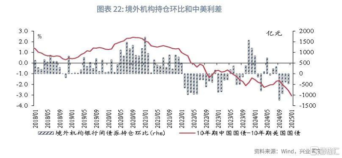 考虑到我国金融市场扩大对外开放,境内外利差对于汇率和境外投资者行为产生影响,进而影响跨境资本流动;央行近期对于债券利率的关注,既包括了对金融机构利率风险的关注,也包括了对于跨境资本流动的关注。自近年来我国境内债券市场扩大对外开放以来,境外投资者的债券持仓和中美利差呈现明显的正相关。2023年12月的中央经济工作会议讲话中曾经指出“密切关注境内外利差扩大和国内存贷款利差缩小等新情况新问题,完善金融宏观调控,促进内外均衡”。2024年以来,央行围绕债券利率的潜在利率风险频频发声;2025年跨元旦之后,人民银行暂停了买入国债,逆回购净投放持续保持低位。2024年9月以来,境外机构债券持仓环比再度转负。从跨境资本流动的角度,我们需要持续关注中美利差的走势和境外机构行为。