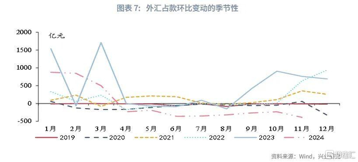 2017年以来,外汇占款的规模大致保持稳定,对于银行间流动性的影响明显下降;2024年4月以来,外汇占款规模持续小幅回落,对流动性形成净回笼。2017年至今,外汇占款大致保持在21-22万亿元左右的水平,年度变动由万亿规模回落至千亿规模。2024年下半年以来,外汇占款环比小幅下降,2024年4月至11月累计下降2000亿元左右。从季节性来看,2024年4月以来的外汇占款环比变动也持续低于其季节性水平,体现为对于人民币流动性的净回笼效应。