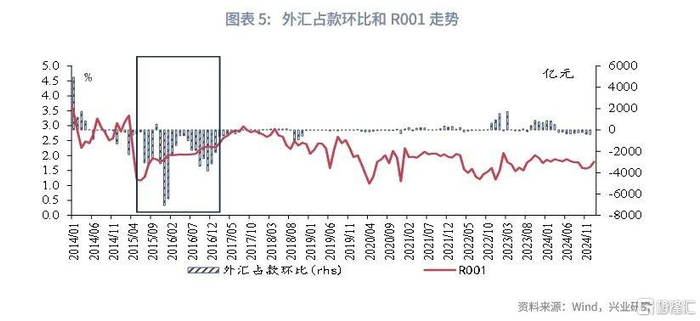 2015年“811汇改”后初期,央行曾一度通过外汇操作向市场上投放外汇流动性、回笼人民币流动性,当时央行继续处于降准降息的周期中,但资金利率的中枢出现了明显上行。例如,对于2015年8月外汇储备的下降,人民银行在答记者问中表示原因之一是“央行在外汇市场进行操作,向市场提供外汇流动性”[3];2017年2月,外汇管理局针对2016年外汇储备变动情况表示,“从(2016年)全年的情况看,央行稳定人民币汇率是外汇储备规模下降的最主要原因”[4]。2015年7月开始外汇占款规模持续下降,全年外汇占款余额下降了2.2万亿元左右;2016年全年,外汇占款余额继续下降了2.9万亿元。尽管2015年全年处于降准降息的周期中,在“811汇改”后,2015年8月26日、2015年10月24日,人民币贷款基准利率继续下调,2015年9月4日、2015年10月24日,存款准备金率继续下调;在外汇占款下降对于流动性的持续回笼之下,R001的中枢自2015年7月开始逐步回升。