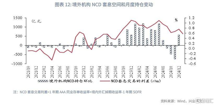 不过,由于境内掉期点被压低,NCD套息交易的吸引力上升,这反而在NCD供需上增加了境外投资者的投资需求。当境内掉期点偏低时,境外机构参与NCD套息交易的吸引力上升,在2024年境内掉期点下行的大多数月份,境外机构都持续净买入NCD。