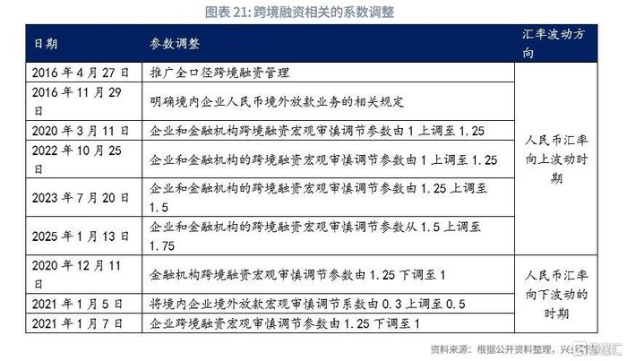 经常调整的审慎参数主要包括企业和金融机构跨境融资宏观审慎调节参数、境内企业境外放款宏观审慎调节系数,二者对跨境融资和境外放款规模的影响公式如下: