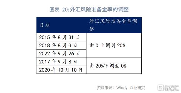 不同于外币存款准备金率是针对外币存款收取的准备金,外汇风险准备金是对于外汇远期交易设定的风险准备金要求,通过引导市场预期发挥效果。外汇风险准备金制度自2015年“811汇改”后设立。2015年8月31日,中国人民银行发布《关于加强远期售汇宏观审慎管理的通知》(银发〔2015〕273号),将远期售汇纳入宏观审慎管理框架,对开展代客远期售汇业务的金融机构收取外汇风险准备金。在人民币汇率向上波动加大的时期,人民银行往往提升外汇风险准备金率要求,通过提升企业购汇成本,起到稳汇率的效果;反之,人民币汇率向下波动加大的时期,下调外汇风险准备金率。外汇风险准备金率最近的两次上调分别发生在2018年8月6日和2022年9月26日。