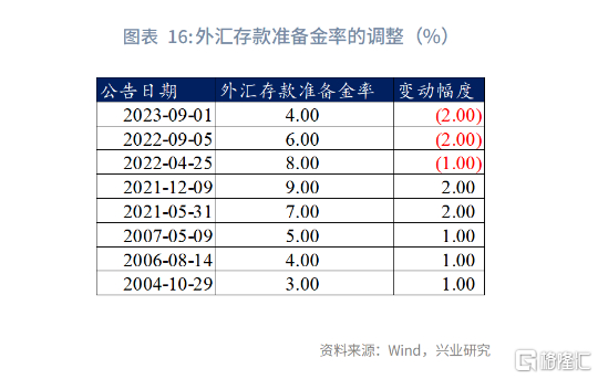 外汇存款准备金率的使用由向下波动转为向上波动时期,通常和其他工具配合使用。外汇存款准备金率在2004年至2021年期间5次提高,主要在人民币汇率向下波动时期动用;2022年4月、2022年9月和2023年9月,外汇存款准备金率分别进行了下调操作,均在人民币汇率向上波动幅度加大时动用。2022年9月和2023年9月,外汇存款准备金率下调时,都出现了流动性偏紧的情况,同期国有大行可能在外汇市场进行了“逆势”操作。
