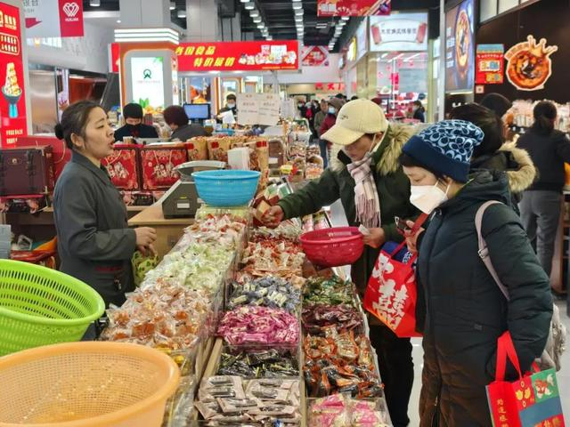 据了解,改造升级后的汇联商厦,如今已被打造成为美食天地,汇聚了包括糕点、熟食、糖果在内的近30个门类,近6000种食品。尤其是在春节前夕,坚果、蜜饯、老字号糕点等传统年货更是迎来了销售高峰。