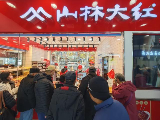店员热情地吆喝着,吸引了不少顾客驻足。大红肠是店内的明星产品,日常250g的大红肠此时已供不应求,采购年货的市民更倾向于买1kg的大红肠。尤其是在春节期间,销量更是节节攀升。“等到了小年夜,我们销售额最高峰一天可做到60万以上,1kg的大红肠基本上当天可卖出两三千根。”山林大红市场总监杨雯告诉记者,“公司今年特别重视这家门店,在过年前三天,公司会安排45个人前来帮忙应对高峰客流。”