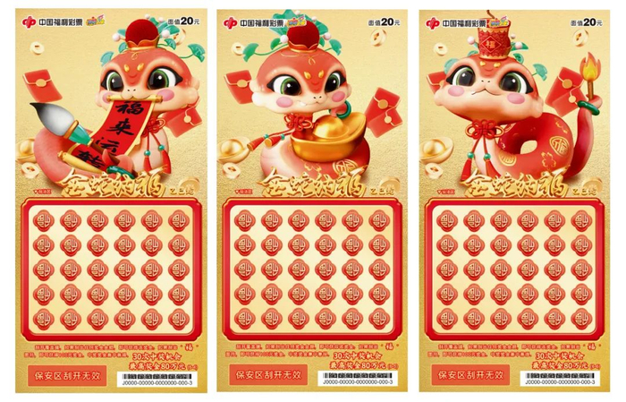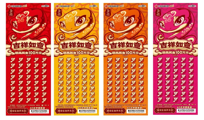 该套即开票包含“金蛇送彩”“金蛇纳福”“吉祥如意”“蛇年大吉”4款游戏,面值分别是10元、20元、30元和50元。票面风格多样,主题寓意美好,融入春节文化、剪纸、手绘、篆刻等元素,为即将到来的新春佳节增添了喜庆色彩。