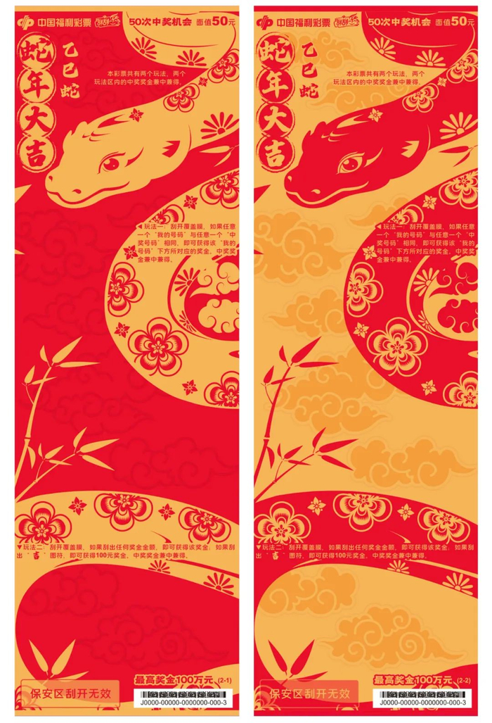 50元面值的“蛇年大吉”是一款双联游戏彩票。票面设计参照篆刻、剪纸中常用的阴阳表现方式,搭配祥云、竹子等元素,具有美观的视觉效果。该游戏有两个玩法,两个玩法区内的中奖奖金兼中兼得。玩法一:刮开覆盖膜,如果任意一个“我的号码”与任意一个“中奖号码”相同,即可获得该“我的号码”下方所对应的奖金。中奖奖金兼中兼得。玩法二:刮开覆盖膜,如果刮出任何奖金金额,即可获得该奖金;如果刮出“吉”图符,即可获得100元奖金。中奖奖金兼中兼得。