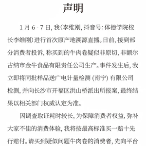 对此,1月11日,李维刚发布视频回应称,自己会安排送检,如果有问题假一赔十,而且自己会先行赔付,后面再和厂家打官司。