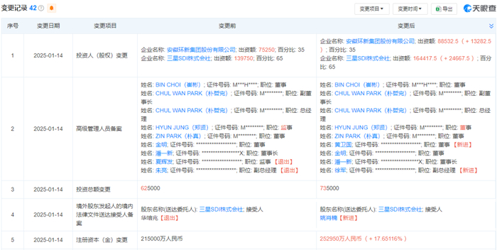 其中三星SDI新增资24667.5万元,总出资额达到164417.5万元,持股比例不变,仍为65%;环新集团新增资13282.5万元,总出资88532.5万元,持股比例同样不变,为35%。