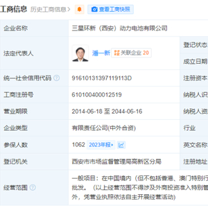 资料显示,三星环新(西安)动力电池有限公司成立于2014年6月,位于西安市高新区毕原三路2655号,法定代表人为潘一新,同时潘一新也是该公司的董事长。