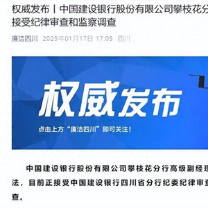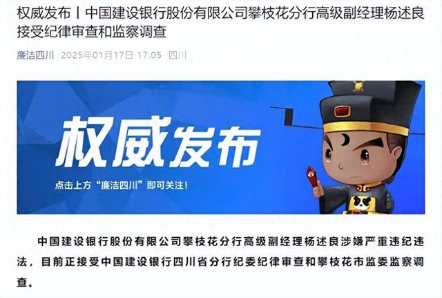 1月17日,据廉洁四川:中国建设银行股份有限公司攀枝花分行高级副经理杨述良涉嫌严重违纪违法,目前正接受中国建设银行四川省分行纪委纪律审查和攀枝花市监委监察调查。