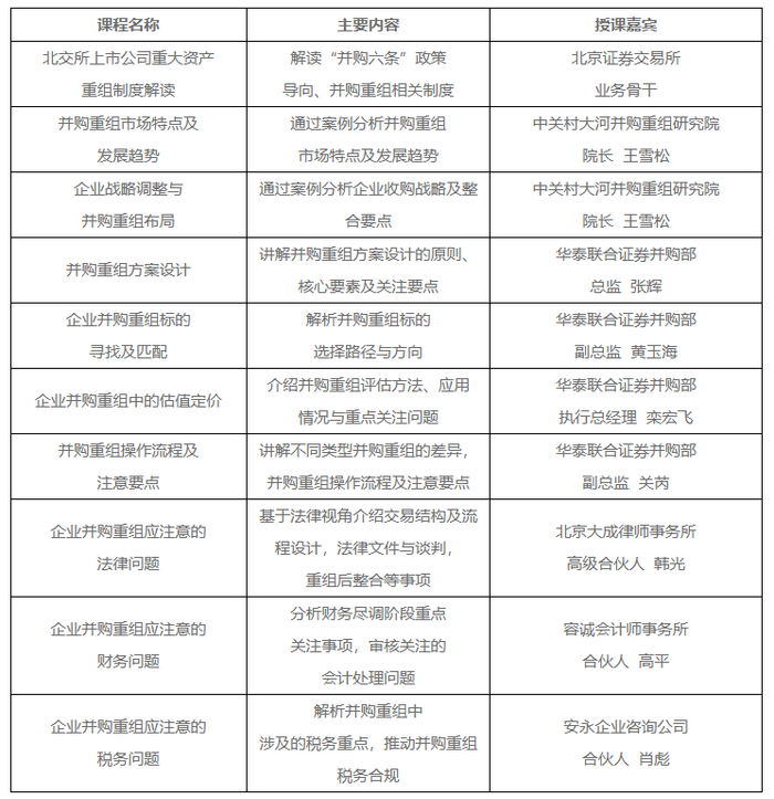 本系列网络课程由并购重组监管政策、宏观环境、实务操作三个模块组成,设置《北交所上市公司重大资产重组制度解读》《并购重组市场特点及发展趋势》《并购重组方案设计》等10门课程,邀请北交所业务骨干,并购重组研究机构、证券公司、会计师事务所、律师事务所等市场一线专家授课,传递并购重组监管理念,剖析并购重组市场特点,分享实操难点解决方案,旨在激发企业并购重组活力,提升并购重组质量。课程具体内容详见下表。
