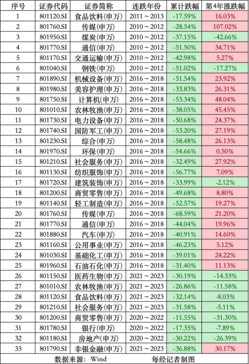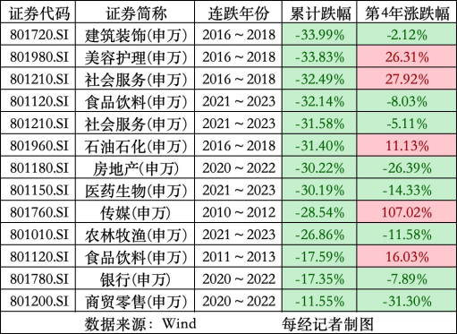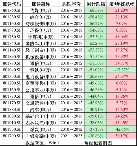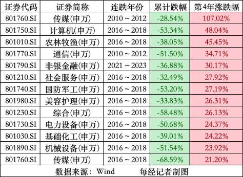 Wind数据显示,2009-2023年,申万一级行业中连续下跌4年的行业板块次数,共有6次,下一年的平均涨幅为23.67%。