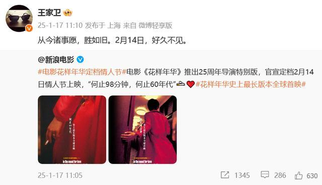 定档消息发布后,导演王家卫转发回应:“从今诸事愿,胜如旧。2月14日,好久不见。”