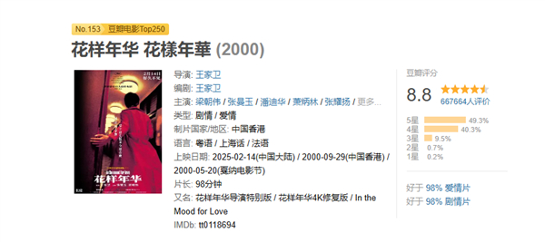 目前《花样年华》在豆瓣的评分为8.8分,超66万豆瓣用户打分,其中5星评价达49.3%。