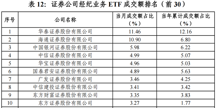沪市ETF12月单月成交额排名中,华泰证券以11.46%继续领跑,海通证券以10.90%紧追不舍,银河证券占比5.98%。紧随其后的是中信证券(4.99%)、华宝证券(4.96%)、国泰君安(4.89%)、广发证券(3.46%)、中信建投(3.41%)、东方财富(3.35%)、东方证券(3.27%)。与年度排名相比,月度排名有所变化。华泰证券依然保持领先地位,海通证券的当月成交额占比提升较为明显。