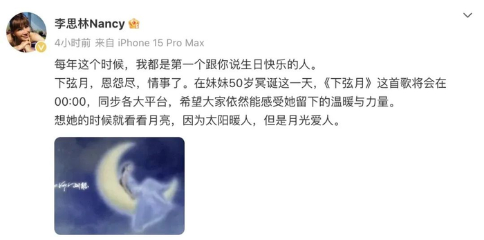 1月16日,李玟的姐姐李思林发文悼念妹妹,并表示李玟的遗作《下弦月》会在1月17日凌晨上线各大平台。
