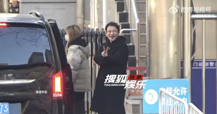 视频里,刘谦看起来很开心,下车后回头对镜头笑着比耶。