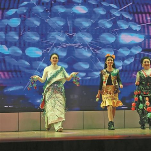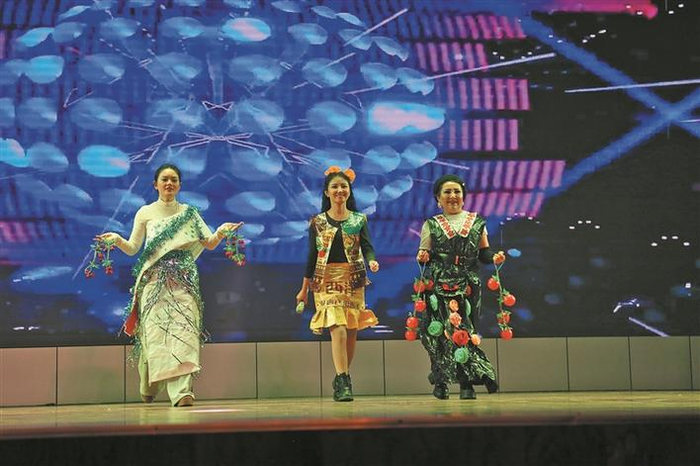 由八十七团文体广电旅游中心工作人员表演的环保走秀节目《团场产业齐亮相》,表演者身穿用作物秸秆、制种玉米、食用菌等材料制作的各式“服装”上台走秀,在完成团场特色农产品互动展示的同时,也瞬间把演出推向了高潮。