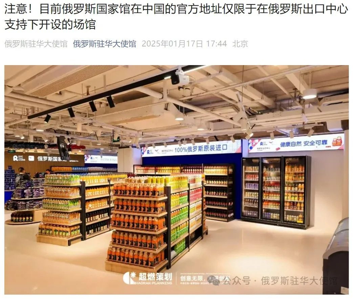 【“俄罗斯国家馆”山寨遍地,俄方澄清】俄罗斯驻华大使馆1月17日发布提醒:目前俄罗斯国家馆在中国的官方地址仅限于在俄罗斯出口中心支持下开设的场馆。呼吁买家在购买产品时多加留意,检查产品的生产地和有效期,以免买到失望的产品。点击查看