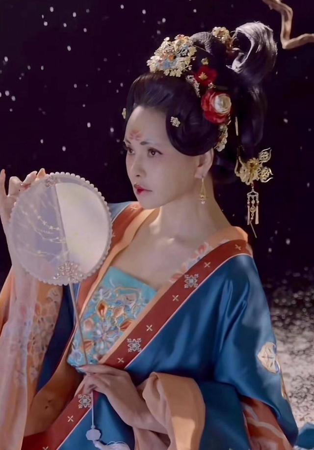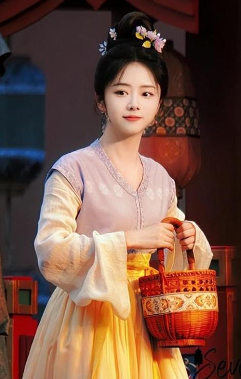 前期,她的扮相简单脱俗,只是在发髻上簪了几朵鲜花,便将角色的清新自然展现得恰到好处。那几朵鲜花娇艳欲滴,散发着淡淡的芬芳,与她甜美的笑容相得益彰。整个妆面干净整洁,底妆自然,没有过多的修饰,凸显了她 “冻龄般” 的面容。她的眼睛明亮有神,笑起来时弯弯的,充满了天真感和娇憨感,完美贴合了唐朝审美中以胖为美的大气明媚感。