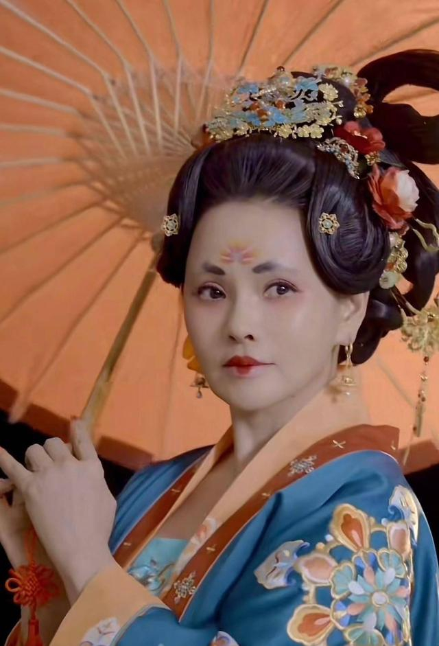 然而,那又短又黑的眉毛,搭配上嘴角向下的深色口红,却让不少观众觉得有浓浓的日本艺伎风扑面而来。在写真中,她时而怀抱琵琶,试图展现唐代女子的才情;时而手持茶杯,做出优雅品茶的姿态。尽管已经年过半百,但她依旧努力地凹着造型,展现出了不服输的精神。