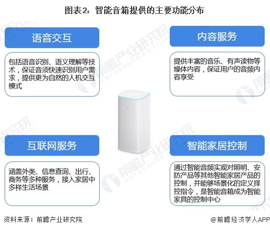 智能音箱主要功能为语音交互、内容服务、互联网服务和智能家居控制等。语音交互包括语音识别、语义理解等技术,保证音箱快速识别用户需求,提供更为自然的人机交互模式;内容服务为提供丰富的音乐、有声读物等媒体内容,保证用户的音频内容享受;互联网服务涵盖外卖、信息查询、出行、商务等多种服务,接入家居中的多种生活场景;智能家居控制为通过智能音箱实现对照明、安防产品等其它智能家居产品的控制,使智能音箱成为智能家具的控制中心。