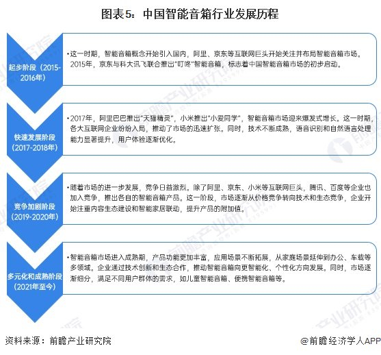 中国智能音箱行业经历了从起步到快速发展的多个阶段。2015-2016年,阿里、京东等互联网巨头开始布局,推出首款智能音箱,标志着市场的初步启动。2017-2018年,阿里巴巴的“天猫精灵”和小米的“小爱同学”等产品相继推出,市场迎来爆发式增长,技术逐渐成熟,用户体验优化。2019-2020年,竞争加剧,腾讯、百度等企业加入,市场从价格竞争转向技术和生态竞争,内容生态和智能家居联动成为重点。2021年至今,市场进入成熟期,产品功能更加丰富,应用场景从家庭扩展到办公、车载等多领域,企业通过技术创新和生态合作,推动智能音箱向更智能化、个性化方向发展。总体来看,中国智能音箱行业已形成较为完善的产业链和生态系统,未来有望在技术创新和应用场景拓展方面继续取得突破。