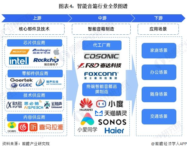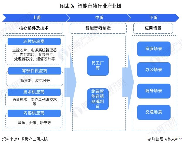 智能音箱的产业链中,上游包括核心部件及技术供应商,如芯片供应商、扬声器和麦克风等零部件供应商,以及语音技术、麦克风阵列技术等技术支持,还有音乐、资讯、听书等内容提供商;中游由代工工厂和终端智能音箱品牌制造商组成,负责产品设计、生产和品牌运营;下游聚焦应用场景,涵盖家庭场景(如智能家居控制)、办公场景(智能助手功能)、随身场景(便携音箱)和交通场景(车载语音交互)等,推动智能音箱的多元化应用。