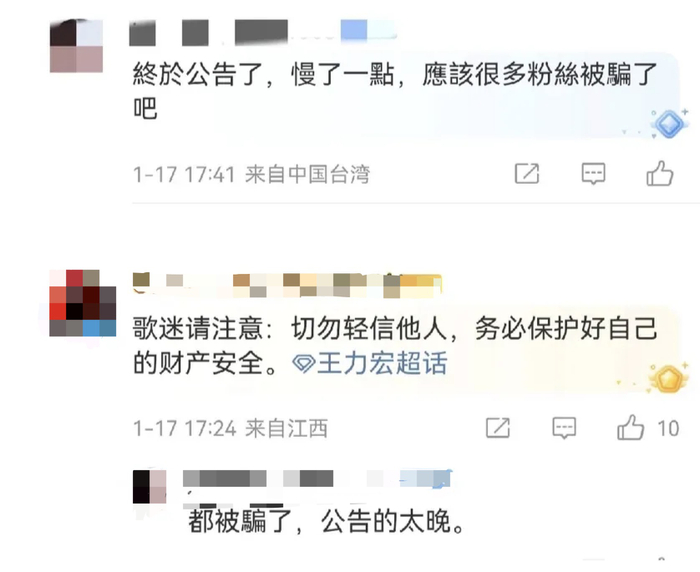 有多个粉丝透露,已经有人被骗了。还有人抱怨王力宏公司的“防骗提醒”公布得太晚了,导致已经有歌迷粉丝被骗。