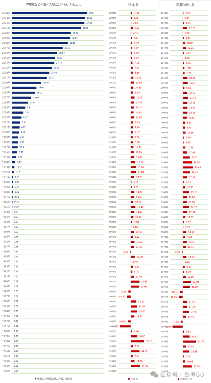 2024年,第二产业GDP是49.21万亿,同比增长5.3%,测算同比3.39%。
