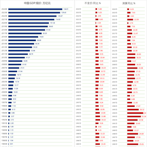 2024年,中国GDP为134.91万亿,同比增长5%,绝对直接测算增幅4.23%。