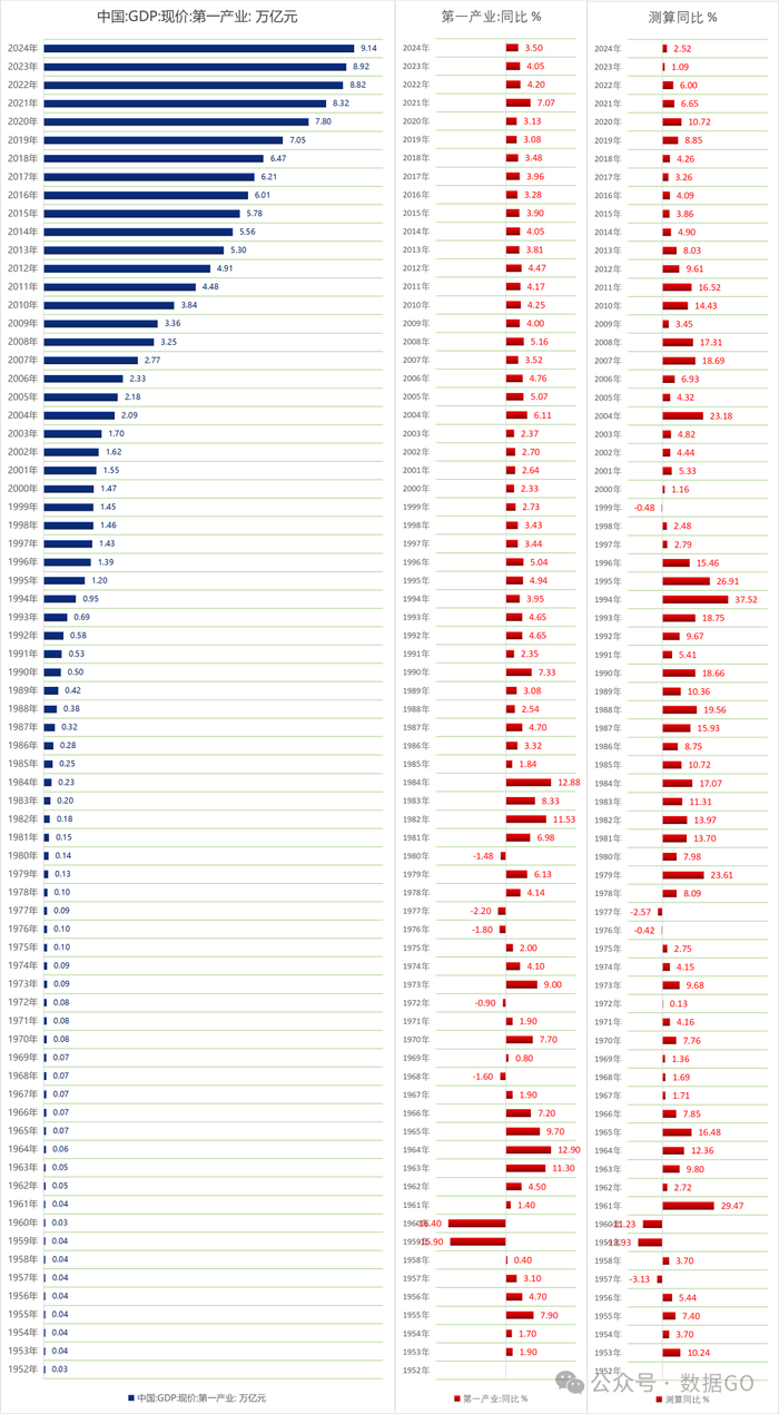 2024年,第一产业GDP是9.14万亿,同比增长3.5%,测算同比2.52%。