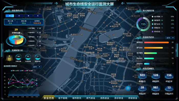 随着我国城市化进程的加快,城市运行安全的复杂性日益凸显,近年来围绕城市生命线安全工程建设、城市内涝防汛、燃气带病运行、供水漏损和安全、地下市政设施普查等均有国家部委明确的文件建设要求。我们积极响应政策要求,紧跟技术潮流,在城市地下市政基础设施监管、城市内涝、燃气、供水等重大安全领域上持续创新突破,构建了“设施普查+隐患排查+平台赋能+运营服务”的生命线综合治理模式。通过先进的管理理念和高新技术,不断赋能各地城市生命线安全工程。例如,在西安市建立了“汛前常态预防、汛中快速响应、汛后总结提升”平战结合管理模式。通过汛前常态化管理和预防处置,汛中多维数据的整合分析和“一点一策”的应急预案精准调度,以及汛后汛情简报总结等工作,让“雨情、汛情、灾情”一目了然,增强了城市内涝防治能力。