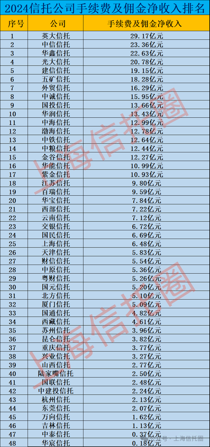 手续费及净佣金收入前10名分别是:英大信托、中信信托、华鑫信托、光大信托、建信信托、五矿信托、外贸信托、中诚信托、国投信托、华润信托等。