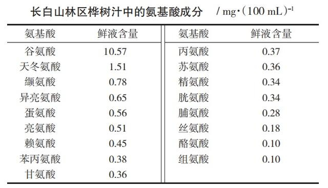 桦树汁中还含有多种人体每日所需的氨基酸。一般桦树汁含有 10 种左右氨基酸, 而长白山林区的桦树汁含有 17 种氨基酸。相关专家对新鲜桦树汁进行了氨基酸测定。